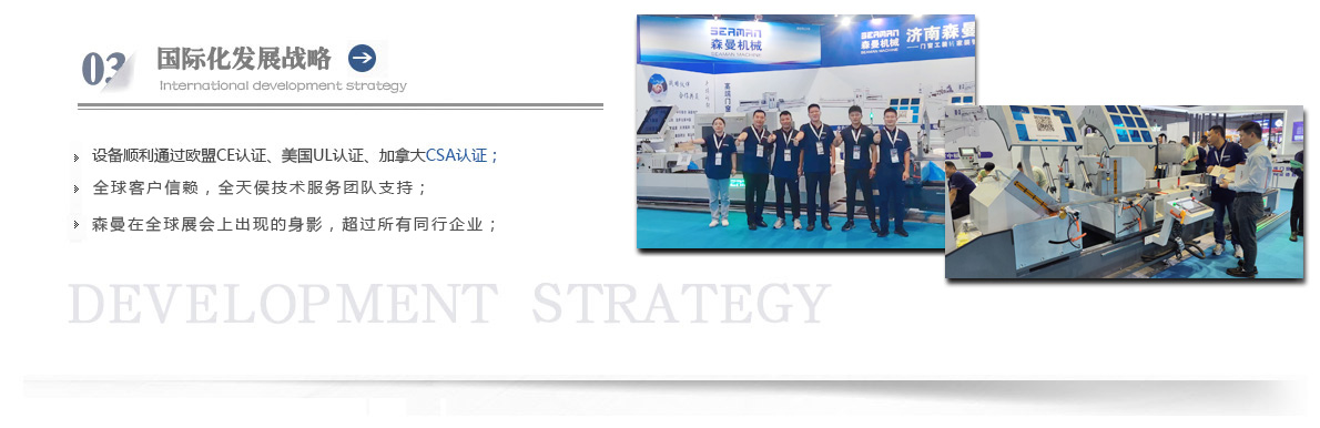 “森曼機(jī)械”作為全球門窗設(shè)備供應(yīng)商,本著"seaman"精神,勇立潮頭,拼搏創(chuàng)新,以爭做行業(yè)為目標(biāo),在行業(yè)前輩發(fā)展的基礎(chǔ)上,努力學(xué)習(xí),積極進(jìn)取。目前公司產(chǎn)品涵蓋塑料門窗設(shè)備、鋁合金門窗設(shè)備、鋁幕墻設(shè)備、鋁木復(fù)合門窗設(shè)備及中空玻璃設(shè)備五大種類,近百個品種。公司產(chǎn)品銷售至全國各地及東南亞、非洲、東歐、北美等幾十個國家和地區(qū)。在這個競爭激烈的年代,我們正努力使我們的產(chǎn)品!